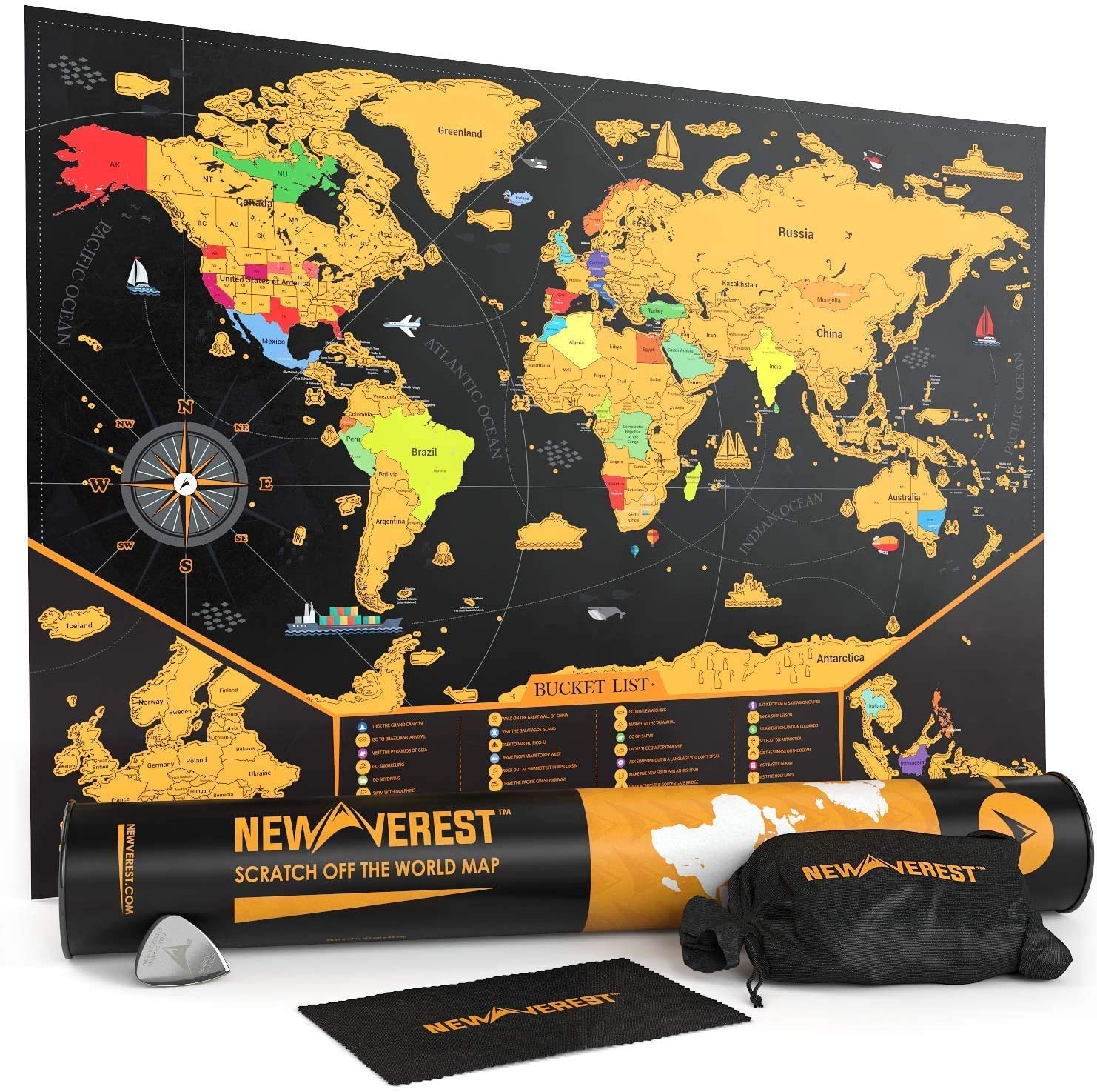 NEWVEREST Scratch Off Map of The World, Detailed World Travel Art Poster, Fits 24″ x 17″ Frame, Comes with Scratch Tool, 20 Push Pins, 4 Stickers, Cleaning Cloth, Carry Bag + Gift Tube