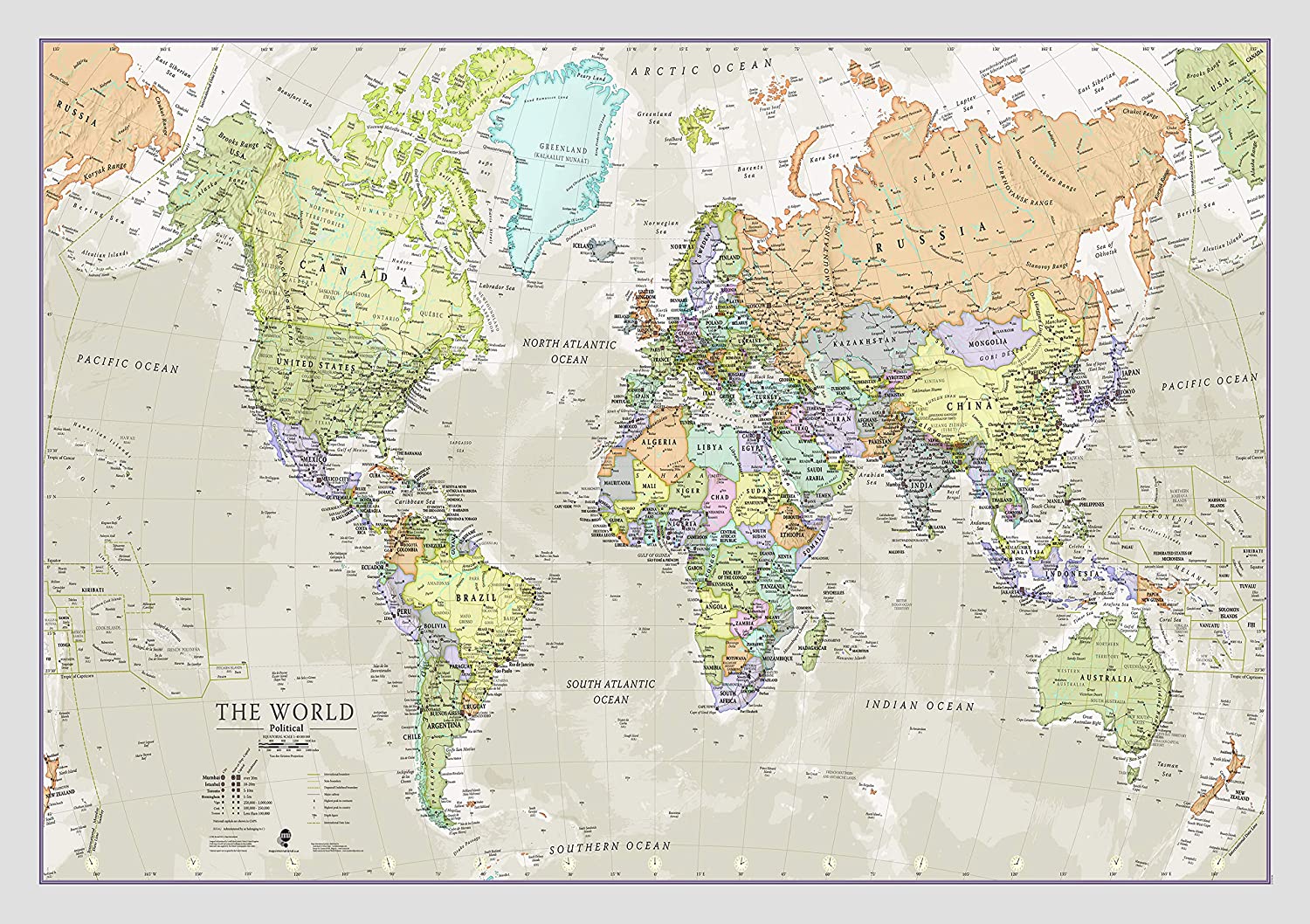 World Map Classic Style – Front Sheet Lamination – Cartographic Detail (A1 23 (h) x 33 (w) inches)